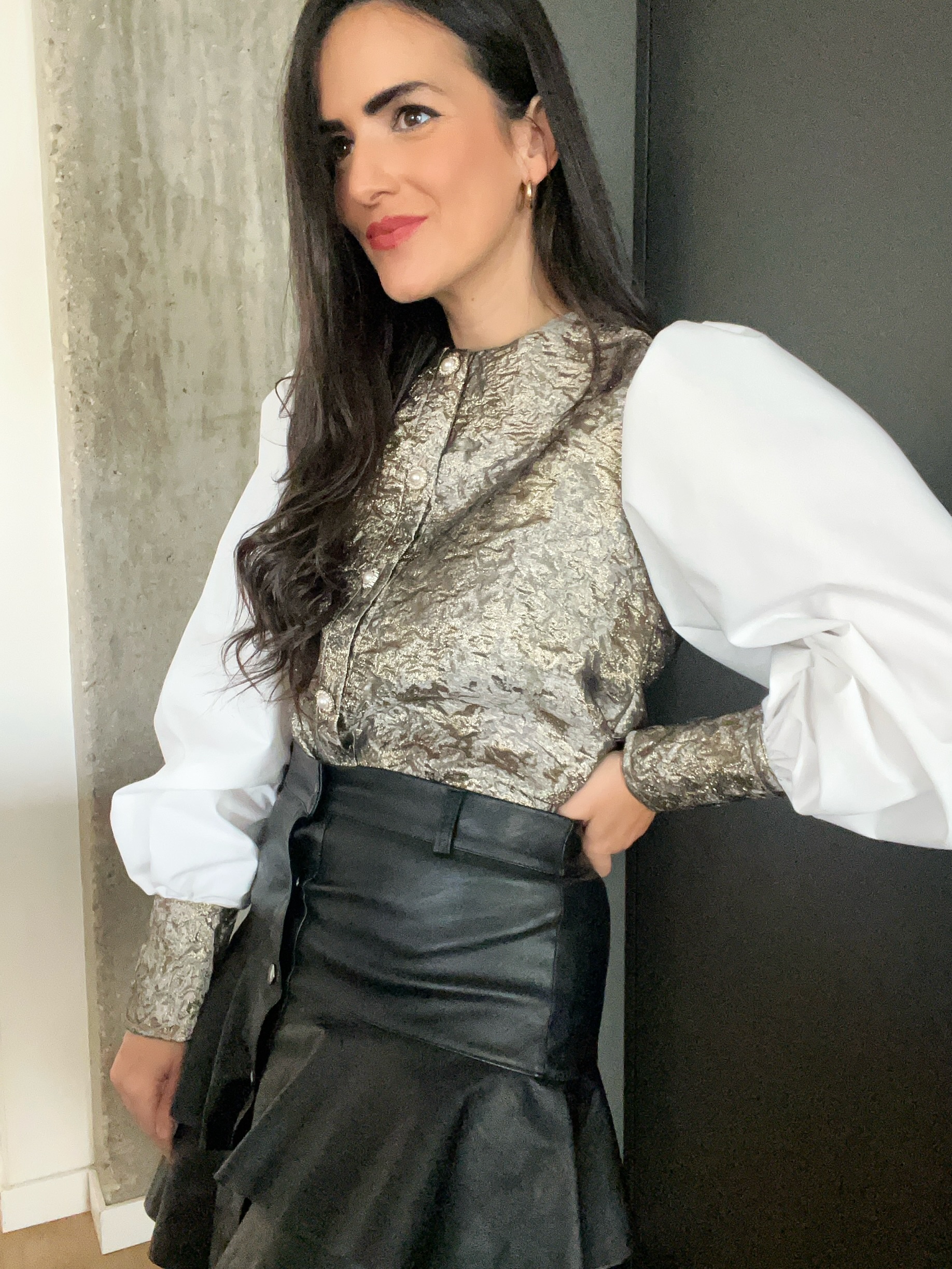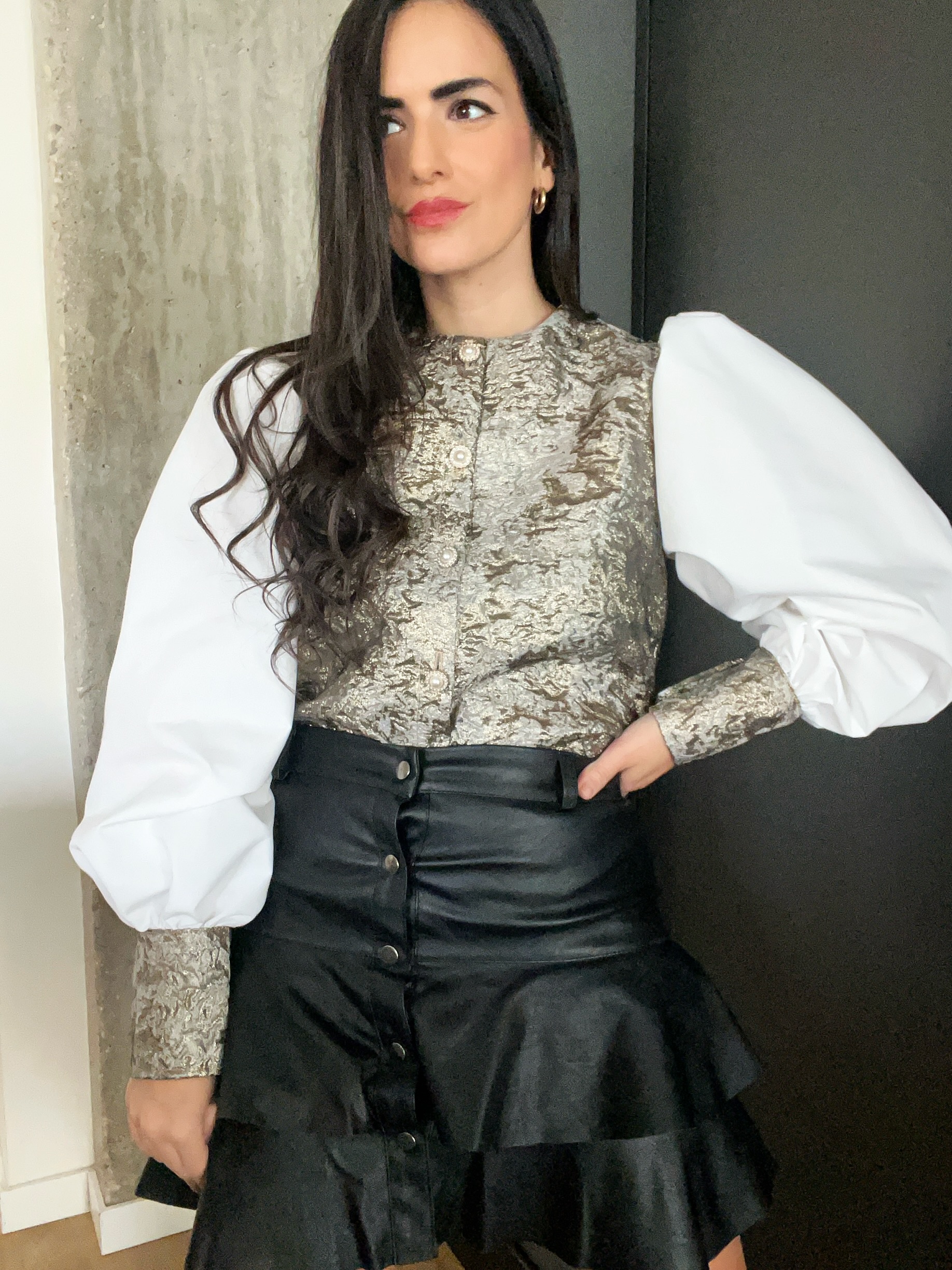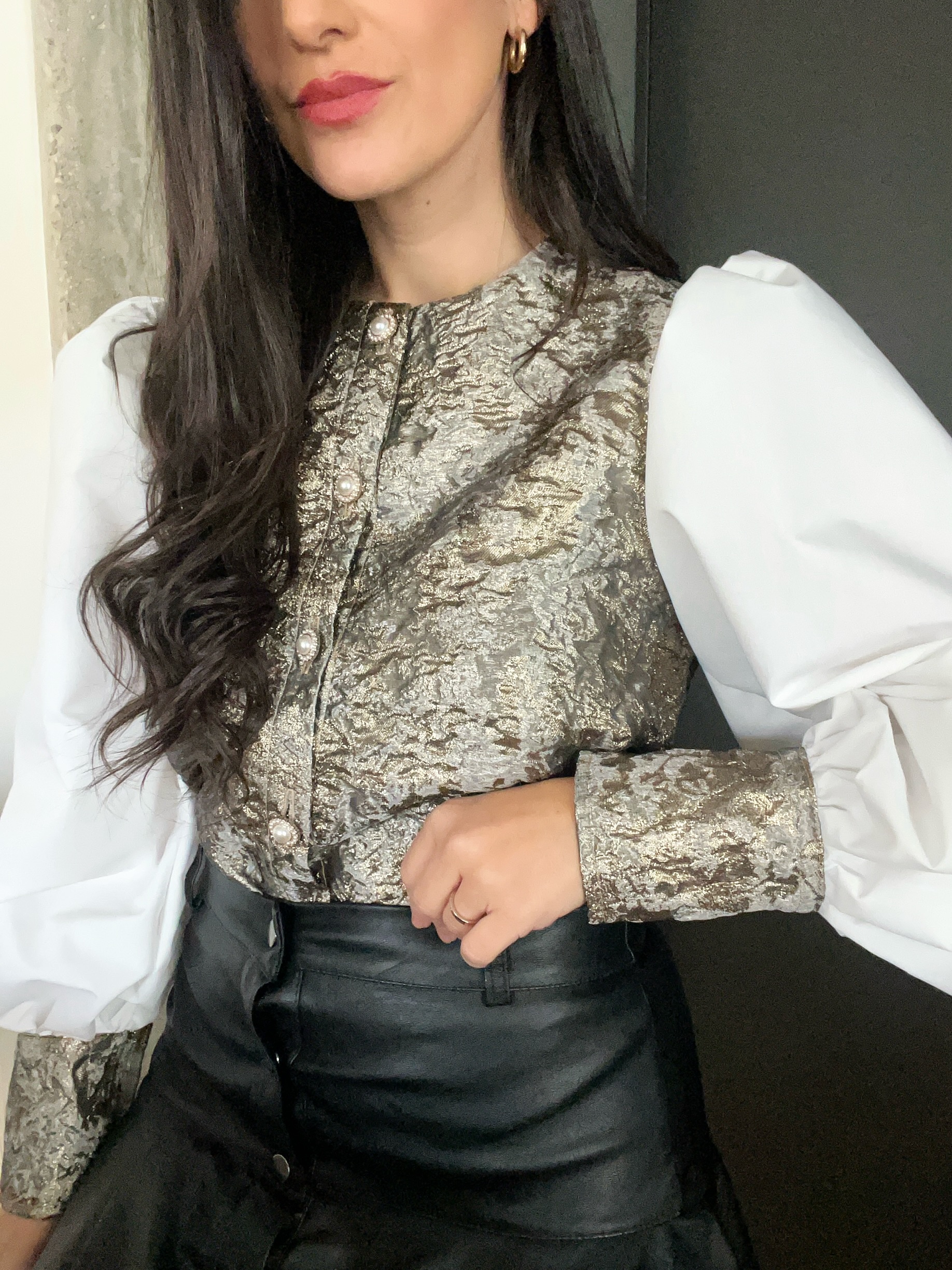 Camisa con cuerpo en brocado dorado. Mangas globo en popelin blanco.