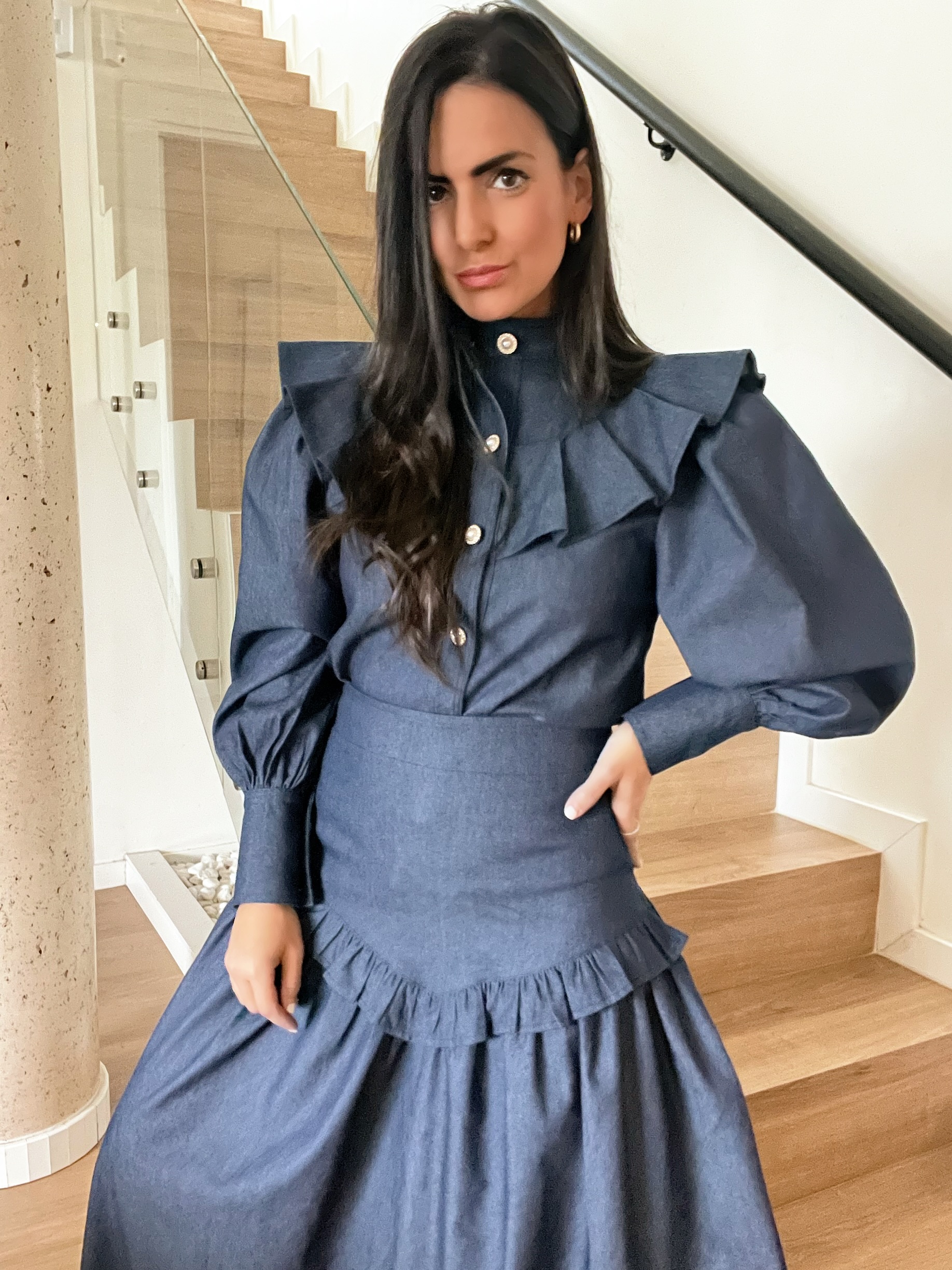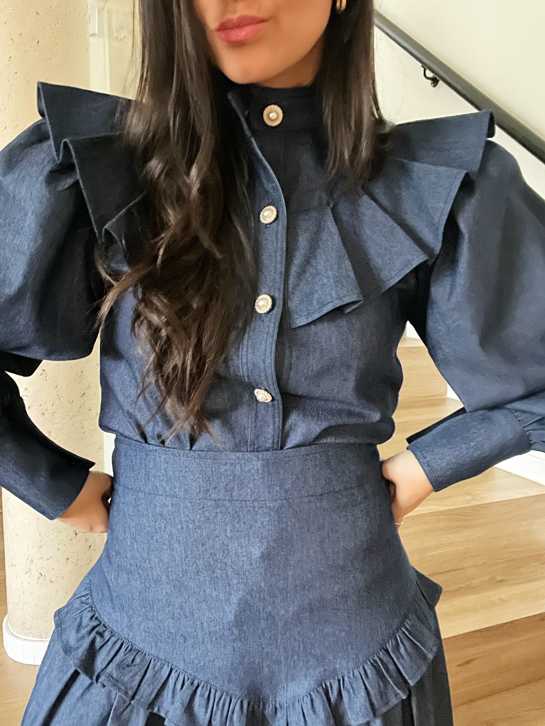 Conjunto de falda y camisa en tela denim.