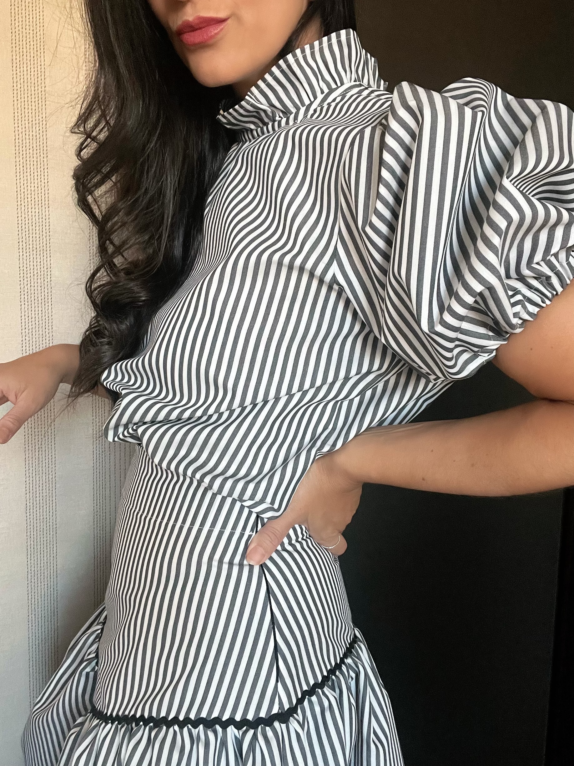 Conjunto de falda y camisa en tela Oxford de rayas gris.